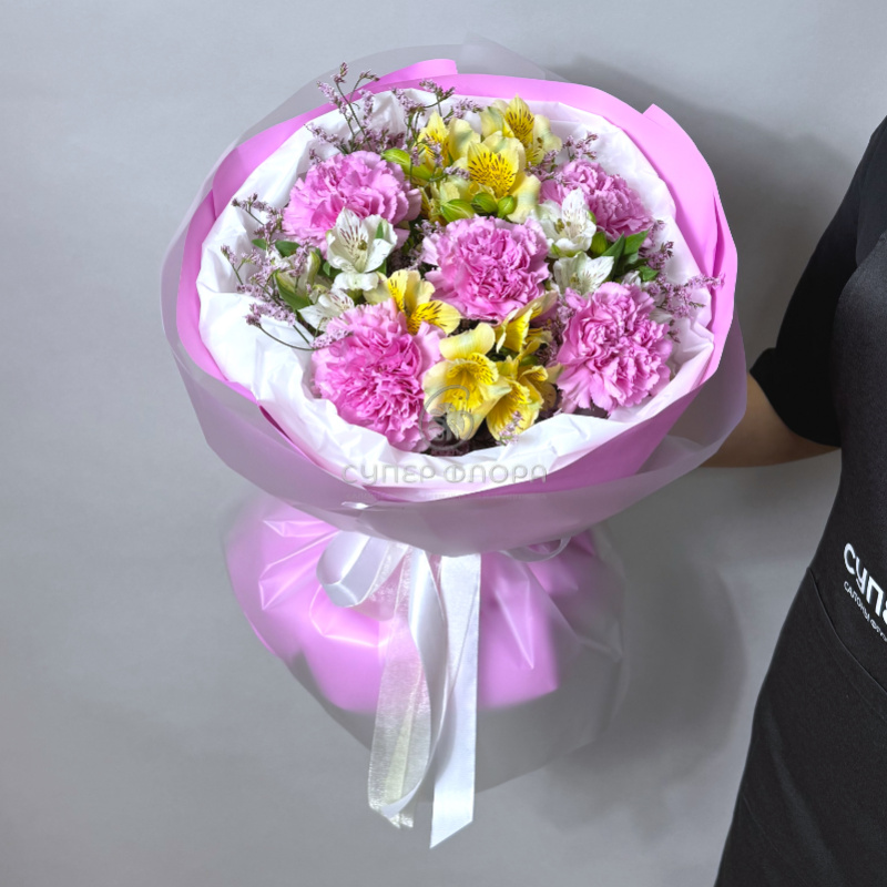 Букет с розовыми гвоздиками и желтыми альстромериями создает нежный и яркий образ, добавляя нотку тепла и радости. Пышные цветы в сочетании с воздушной упаковкой смотрятся элегантно и празднично. Идеальный выбор для любого торжества или просто для выражения любви и заботы.