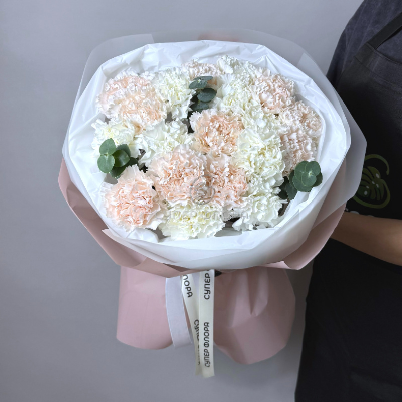Букет из белых и персиковых гвоздик, элегантно упакованный в белую и персиковую бумагу с декоративной лентой. Нежные оттенки и пышные соцветия создают романтичный и трогательный образ, идеальный для выражения симпатии и заботы. Такой букет станет прекрасным подарком для близких и друзей в любой ситуации.